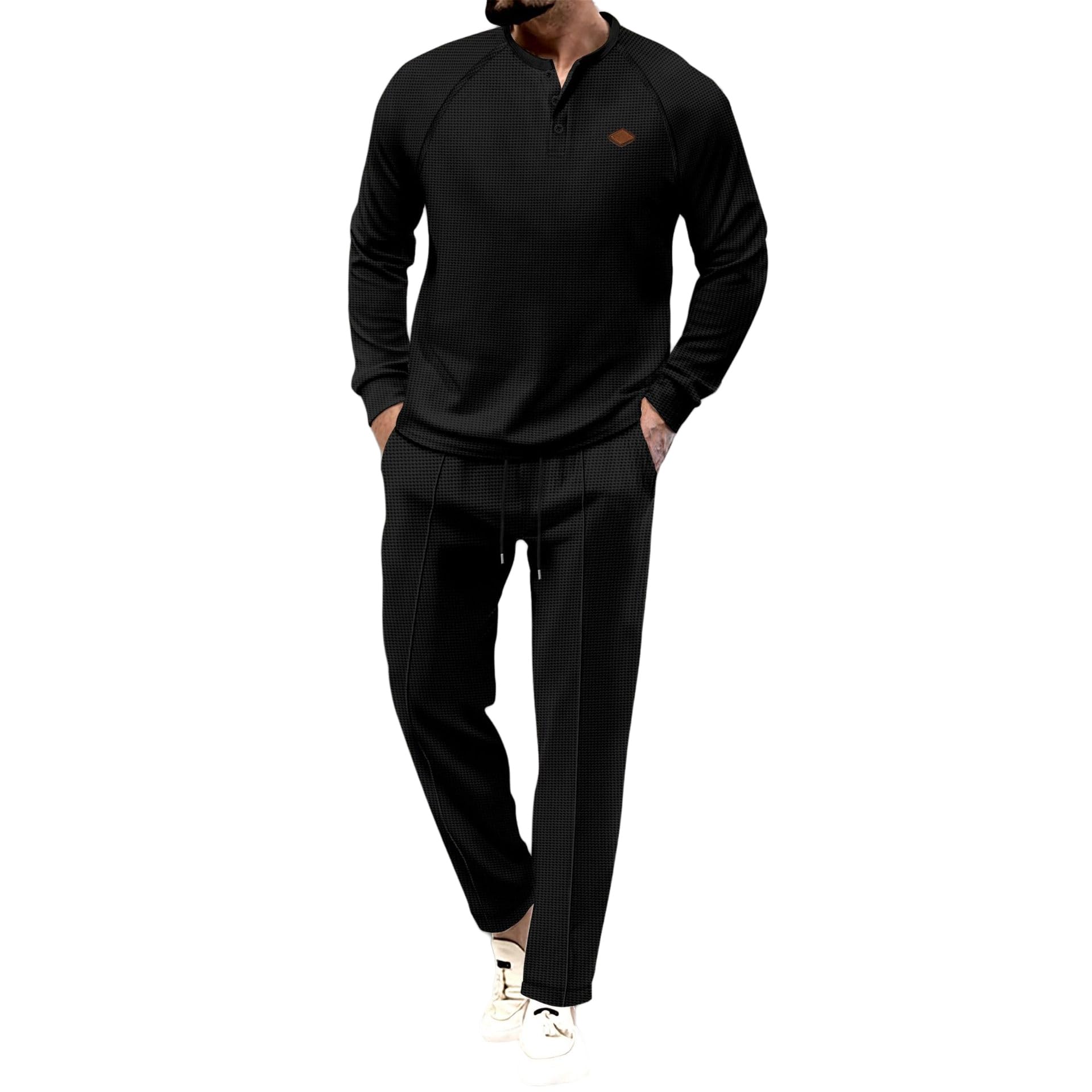 YSERB Men's 2 Piece Outfits Waffle Knit Casual Athletic Jogging Sets Long Sleeve Henley Shirt Pants Set Yoga Beach Outfits