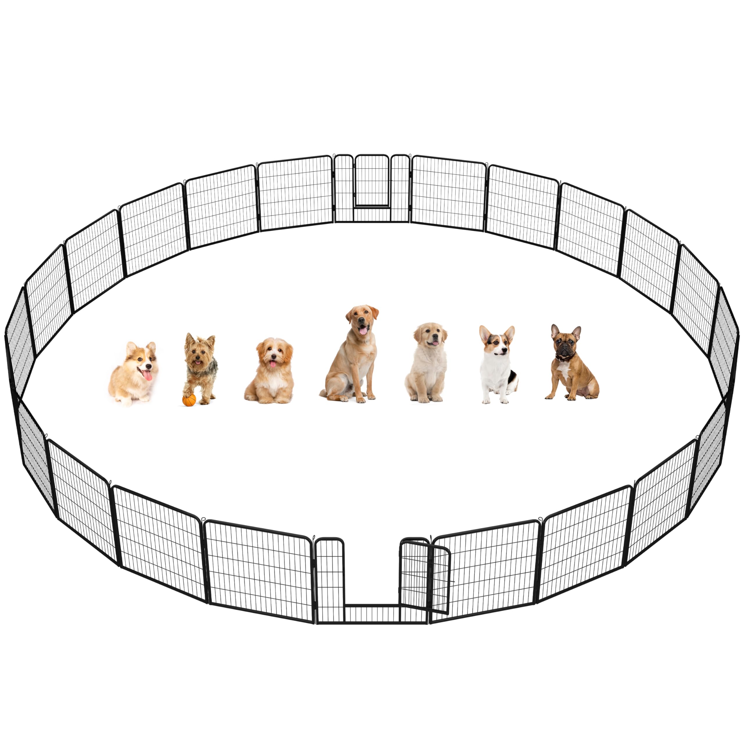 Great for Camping: The foldable and portable design of this puppy playpen allows for hassle-free transfer from your residence to your vehicle, making it a perfect addition for those looking to go RV camping or travel with their pets Reinforced Details for Sturdy Structure: Well-constructed for excellent sturdiness. Boasting the thicker wire diameter and dense wires to bring the closer wire gaps provides a safe, enclosed area for your pet to exercise and play. Reinforced frame in detail keeps walls not easily collapsing when pets knock over Not Just for Dogs: This dynamic and expandable pet fence is not limited to dogs and is suitable for small or medium-sized animals such as toy poodles, corgis, rabbits, ducks, bunnies, and puppies. It can be used both indoors and outdoors Creating Different Shapes: Sold in a set of 24 metal panels. Each panel of this versatile dog playpen measures 26″ W × 31.5″ H . By connecting them with metal bars, the playpen can be assembled in various shapes and sizes, including square and rectangular configurations. Add or remove panels as needed to achieve the desired shape Easy Assembly: Assembly of our dog fences is quick and easy, taking just a few minutes with the help of our detailed instructions. No tools are required for assembly. When using the playpen indoors, we recommend placing it on a dog pad or carpet to prevent scratching your floors or any noise disruptions Our pet playpen boasts a premium-quality, black-finished steel construction that ensures longevity. Ideal for pets, this fence creates a secure, enclosed area with an open top for play and exercise. Use it to limit your pet's space or to keep them away from other animals. This heavy-duty playpen is suitable for dogs, ducks, rabbits, and more. It's simple to set up without requiring any tools and can be utilized indoors, during RV camping or traveling, or for other yard activities. Metal stakes connect the panels, making it easy to construct various shapes by adding or removing panels.Specifications:Color: BlackMaterial: MetalDimensions for Each Panel: 26″ W × 31.5″ H × 0.5″ ThicknessDoor: 28.5″ H × 14.2″ WAnchor Stake Length: 32.3″ LSquare Tube (outer frame): 0.5″ × 0.7″Item Weight: 30 lbShipping Weight: 34.2 lbRectangle Enclosure Dimensions: 179" L × 128 " W × 31.5" HRectangle Enclosure Area: 159 sq. ft.Square Enclosure Dimensions: 153" L × 153" W × 31.5" HSquare Enclosure Area: 164 sq. ft.Quantity:21 x Panels3 x Panel with Door24 x Anchor StakesNote: 1. Please allow a 0.5″ measurement tolerance.2. The pet species and usage scenarios indicated in the product descriptions and images are for reference only. Please order products based on your pet's characteristics and needs.3. Remove collars, tags, and leashes to prevent entanglement before placing your pet in the playpen.4. Use only on flat surfaces; avoid uneven terrain.