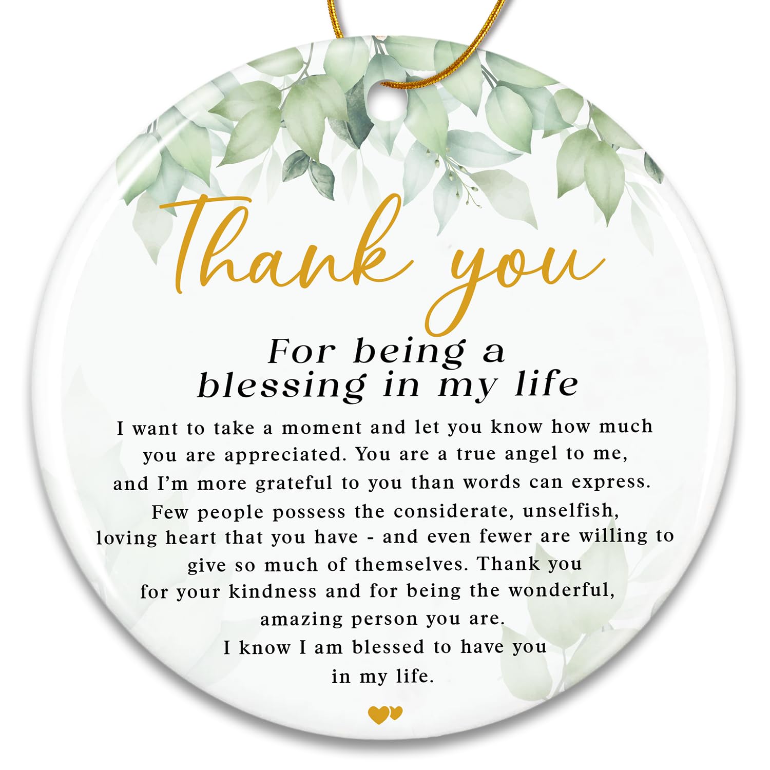 APPRECIATION GIFTS FOR WOMEN/MEN: Seeking a heartfelt gesture? Our ceramic ornament, adorned with the uplifting quote is perfect for expressing gratitude and appreciation. Suitable for men or women, it serves as a lasting reminder of the impact they've had. Let your loved ones know that their efforts are cherished and will never be forgotten. Ideal gift for thank you, retirement, farewell, goodbye, going away, leaving, Administrative Professional Day KEEPSAKE GIFTS: The ornament's design beautifully encapsulates an inspiring message, providing a daily source of motivation for your coworker, boss, friend, teacher, daycare, nurse, manager, social worker or anyone deserving of appreciation. It effortlessly infuses their workspace with inspiration. This versatile gift is fitting for birthdays, anniversaries, graduations, leaving, new job, Teacher Appreciation, Boss's Day, Christmas, or any occasion where expressing gratitude is paramount. PERFECT DIMENSIONS FOR VERSATILE DISPLAY: Our ornament hanger features an ideal 2.87 inch/7.3 cm diameter and a slim 0.12 inch/0.3 cm thickness. This lightweight and striking piece effortlessly integrates into any setting. Whether enhancing your home decor or seeking a thoughtful gift, our exquisite craftsmanship elevates any environment EXPERTLY CRAFTED FROM PREMIUM CERAMIC: Revel in the timeless elegance of high-quality white ceramic, celebrated for its exceptional durability. Both sides showcase identical, vibrant patterns that resist blurring and fading. Waterproof and wear-resistant, this ornament retains its pristine appearance for years ELEGANT AND THOUGHTFUL PACKAGING:Our ornament is accompanied by a two-sided design, a ribbon for easy hanging, and a meticulously crafted gift box. The attached ribbon allows for effortless display from any angle, whether in a classroom or at home. The high-quality brown cardboard box ensures the ornament remains well-protected during transit, safeguarding against any damage Thank You Gifts for Women Men - Appreciation Gift for Coworker Boss Teacher Nurse Mom Friend - Thanksgiving Day Gifts for Family - Being A Blessing in My Life - Ceramic Christmas Ornament 2025