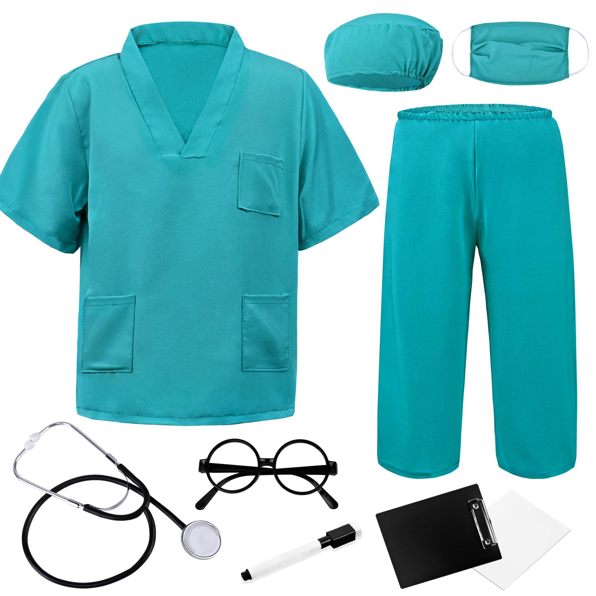 9Pcs Doctor Costume for Kids — Scrubs top & pants with stethoscope, mask, cap, glasses, and clipboard with dry-erase board & pen — a complete set for realistic and fun doctor dress-up. Kids’ Medical Scrubs — Made of a 65% polyester and 35% cotton blend, breathable, easy to wash, and built to last — perfect for medical role-play and dress-up fun. Real Working Stethoscope — Kids can hear a heartbeat, making dress-up more exciting and inspiring STEM learning. Realistic Doctor Accessories — Clipboard with reusable chart lets kids record checkups and dress up as doctors, nurses, dentists, or vets, building creativity and confidence. Perfect Gift — This doctor costume for kids is Ideal for Halloween, Career Day, school plays, pretend play, or dress-up at home, and a great birthday or holiday gift for boys and girls 3-12. Care instructions: