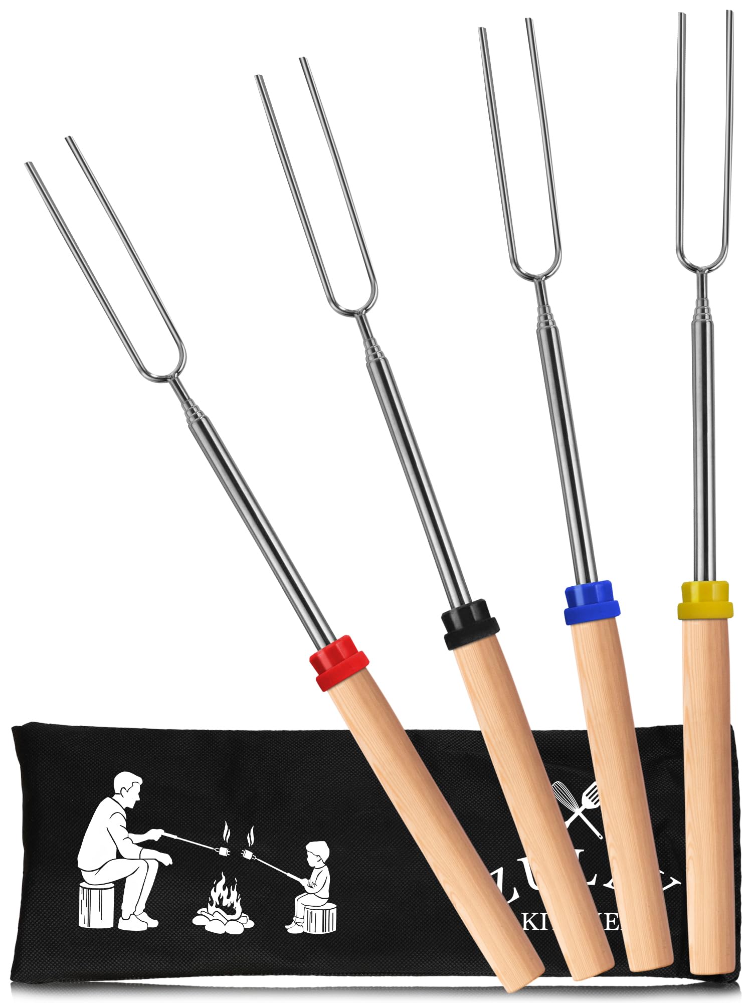 Premium Quality, Perfect For Bonfires: Take camping to the next level! These Telescopic Marshmallow Roasting Sticks are made of non-toxic heat-treated 304 Stainless Steel. The rods and tubes are arc-welded in place with a prong distance of 3.5 inches for optimal roasting. Built with a heat-resistant finely polished wood handle with a plastic end to hold the metal so it does not get warm all the way. Ergonomic Kid-friendly Design: These stainless steel NON-SHARP forks have an extendable and collapsible feature that could be stretched up to 32 inches, 3x by its original length of 12 inches to keep you and your child away from the fire as your food is roasting away on the other end. Perfect s'mores, sausages, hot dog, barbecue or wieners plus a comfortable wooden handle for a firm and steady grip. Color Coordinated Feature: The Zulay Telescopic Marshmallow Roasting Sticks Bundle comes with 4 Pieces of color-coordinated forks that are attractive, easier to handle, and durable enough to last for all your outdoor adventures. Now, you don’t have to worry about your kids fighting over roasting time, they will have a stick of their own as it comes with 4 bright and lively colors that they can choose from. Easy To Clean & Store: Cleaning up marshmallow goo has never been this easy. Yes, these stainless steel telescope skewers are dishwasher friendly! They are lightweight and come with a black polyester drawstring bag for quick and easy stuff storage. They are reusable and zero waste. No need to throw away after when s’more time is over! No Hassle, Zulay Guarantee: We love and take pride in our Telescopic Marshmallow Roasting Sticks and we back this up with a lifetime guarantee. Have the confidence that this product will last, if there are ever any issues, just contact us and we will make it right. Order now and be assured that this product will live up to your expectations, guaranteed. If it does not, we got you covered. Chances are, you will never need to reach out. No campfire is complete without some perfectly roasted marshmallows and for that Zulay’s Telescopic Marshmallow Roasting Sticks. Made with non-toxic and heat-treated 304 stainless steel, this smores kit for fire pit is perfect for roasted marshmallows for both indoor and outdoor bonfire adventures. With extendable and collapsible features, you can use these roasting sticks while maintaining a good distance from the heat. Our marshmallow roasting sticks are ideal for letting kids enjoy the bonfire. It is made with non-sharp forks and a comfortable wooden handle for a firm and steady grip. The Zulay Telescopic Marshmallow Roasting Sticks Bundle comes with color-coordinated forks so you don’t have to worry about your kids fighting over roasting time. The lightweight camp fire sticks are reusable and can be easily packed in a drawstring bag. It makes a great addition to camping accessories, camping essentials, glamping accessories, fire pit accessories for outside, campfire cooking equipment, and camping cooking. Use these are marshmallow sticks for fire pit, hot dog sticks for campfire, skewers for kabobs, skewers for appetizers, skewers for grilling, hot dog sticks for campfire, grill skewers for outdoor grill, shish kabob skewers, bbq skewers and metal skewers. Make your special ones’ adventure sweet by surprising them with these skewer sticks as a birthday gift, Christmas gift, Thanksgiving gift, Valentine’s day gift, anniversary gift, Mother’s day gift, Father’s day gift, housewarming gift, and camping gifts.
