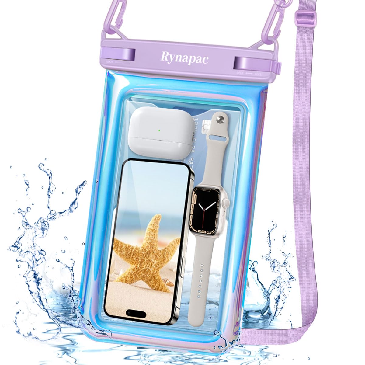 【IPX8 Waterproof Rating】- As per its IPX8 rating, this waterproof phone pouch floating keeps your phone bone-dry even when submerged. Whether you're planning a beach vacation, going kayaking, or just want to protect your phone from accidental water spills, this floating waterproof phone case for swimming is a reliable and must-have choice. The double interior pocket design allows you to keep valuables such as credit cards, cruise cards, cash, IDs, and cell phones in the waterproof cell phone pouch for complete safety and dryness 【Universal Compatibility】- This waterproof phone case with adjustable lanyard easily accommodates larger phone models such as the iPhone 17 16 15 14 Pro Max, Samsung Galaxy S25 S24 S23 Ultra, Google Pixel 9 10 Pro, and more, and the adjustable length of the lanyard allows you to hang it comfortably around your neck or across your shoulder (Note: naked phone size, if your phone's case is too big, please remove the case before putting it in) 【Beach Vacation Essentials】- The Rynapac water proof phone pouch iphone is designed for outdoor activities such as beach, cruise ship, fishing, swimming in pools, sailing, skiing, boating, kayaking, snorkeling, tubing, rafting, and other waterpark activities, so that you can keep your device away from water, dust, and snow, and enjoy life to the fullest 【Responsive Screen Touch】- Even when sealed, the pouch's screen remains highly responsive, ensuring that you can text, browse, and take photos without any hassle. This large waterproof phone holder doesn't hinder touchscreen use, ensuring your phone's functionality 【Ultra Clear Photography】- The cell phone water protector pouch not only keeps your device safe but also ensures your photos remain strikingly clear. Whether you're snorkeling in the ocean or taking a beach selfie, the pouch's transparency guarantees you capture underwater moments with ease and incredible detail. Say farewell to blurry shots and embrace crystal-clear underwater photography with this cell phone waterproof pouch 【Warm Reminder】- Read the precautions carefully before using the phone waterproof pouch. Test the waterproof function with a paper towel before each use, squeeze air before sealing, and submerge in water for about 10 minutes. (Hydraulic pressure under certain water depths would impact the operation of the mobile phone touchscreen, Please take photos by volume buttons, it is recommended to dive for no more than 10 minutes. Do not store sharp objects with this beach accessory for vacation. Avoid exposure to the sun to prevent the phone from overheating and shutting down automatically) [Up to 10''] Waterproof Phone Pouch Floating, IPX8 Underwater Cell Phone Holder with Lanyard for iPhone 17 16 15 14 Pro Max, Galaxy S25 S24 S23 Ultra, Beach Cruise Ship Essentials Travel Must Haves