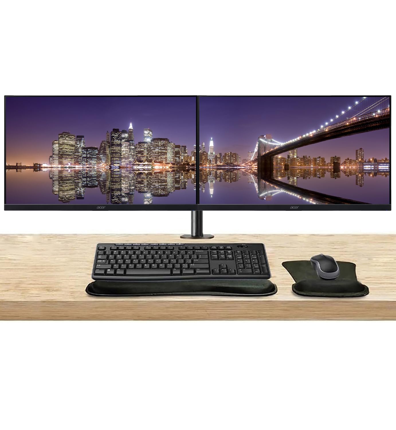 Accessories: Dual monitor stand with heavy duty desk clamp for mounting on the back of desks, detachable bracket plates and fully adjustable arms. Gel Mouse & Keyboard Wrist Rest Set