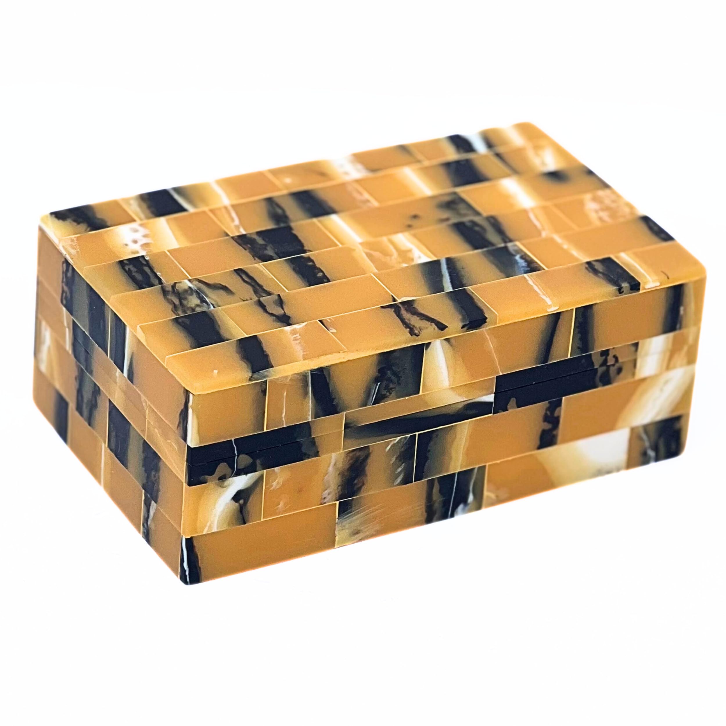 Item Dimension : The upper size of box is 5" x 3" x 2" inches, Inner size of box is 4.5" x 2.5" x 1.5" inches, Weight is 220 gram. Handmade natural inlay decorative keepsake would definitely be an awesome and innovative present. Traditionally design and Handmade Yellow Black Geometric Pattern Inspired Bone Inlay and MDF wood to ensure you have a durable and unique, one-of-a-kind product with hand buffed polished. This Keepsake and decorative boxes suitable for any bedroom closet or office that will beautifully match your décor and style too. An Ideal Present for Someone Who Loves Stylish Accents In Their Home. This beautiful Bone Inlay Decorative Box is a timeless and sophisticated piece which will beautifully enhance any room in your home. A true life piece, this exquisite bone inlay box will bring you pleasure for many years to come. It is not only beautiful outside But also has enough storage space Inside to store watch & jewelry, keys, accessories in the box to be handy. Stylish, charming, eye-catchy inlay box will add grace to your love of giving. This Storage box in style with lampshade or candle holders as a centerpiece. Our decorative boxes are not just functional lid on the head but artistic made of bone inlay. Box is something that can keep the smallest and important things that you might lose. We all need such boxes in our daily lives to store and remember things.This Stylish Bone Inlay Box is perfect to store your beautiful treasures. The intricate geometric pattern carved from bone, creates a beautiful contrast against the colorful resin. Our decorative boxes are not just functional lid on the head but artistic made of bone inlay. The product may be cleaned with a soft dry cloth. A true life piece, this exquisite bone inlay decorative box will bring you pleasure for many years to come.