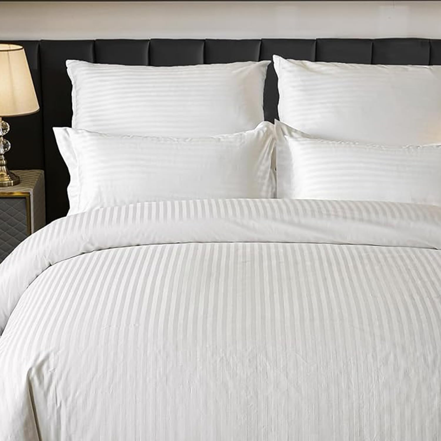 ✅RIGHT FIT – The package includes a cozy and comfortable 1 Piece Duvet Cover With 2 Inch decorative Flange gives an elegant, seamless look. Size of the Alaskan King Duvet Cover is 132x120 Inch. The duvet cover can be used with duvet insert, down / alternative comforters, weighted blankets or as blankets itself without any inserts.Duvet Comforter Insert Is Not Included. ✅HIDDEN ZIPPER & CORNER TIES - The hidden zipper closure is more convenient and beautiful than other closure. We have a flap to cover the zipper closure so that it is invisible and durable, making no noises during moving. At the same time, corner ties inside your duvet cover can help secure comforter in the right place from slipping into a pile and keep you comfortable all night long. ✅SOFT & SATIN SMOOTH – Our Duvet Covers are made with sateen weave construction, which makes it soft and silky. The fabric is made of cotton that is naturally grown which makes it smooth without affecting your skin. We only use extra-long staple cotton fiber to give you a long lasting, high quality, soft and silky, hotel like feel right at home. In addition, cotton being a naturally breathable fabric, helps in a good night’s sleep every time. ✅LUXURY 800-TC COTTON DUVET COVER- Our Super Soft Duvet Cover is the Best Selling Product on Amazon. They’ve the everlasting comfort of 5 Star Hotel Style Duvet Cover at an AFFORDABLE price. Cool & long-lasting with a specialized finishing process to enhance the breathability of the fabric. ✅VIBRANT CHOICES: Pick from a colorful selection of non-fading luxury bedspreads, from classy to boho and pastel to earthy, to find a soft and fuzzy comforter cover that matches the décor aesthetic of your master suite, guest room, kids bunk beds, or vacation house. Each fabric batch is tested for colorfastness and shrinkage to make sure your eBeddy Linens bed sets don’t pill or fade over time. eBeddy Linens Luxury Duvet Cover Extra Large King Size 136x120 Inch 100% Long-Staple Egyptian Cotton Soft and Breathable 1 Pieces Comforter Cover Only With Zipper Closure & Corner Ties, White - Striped