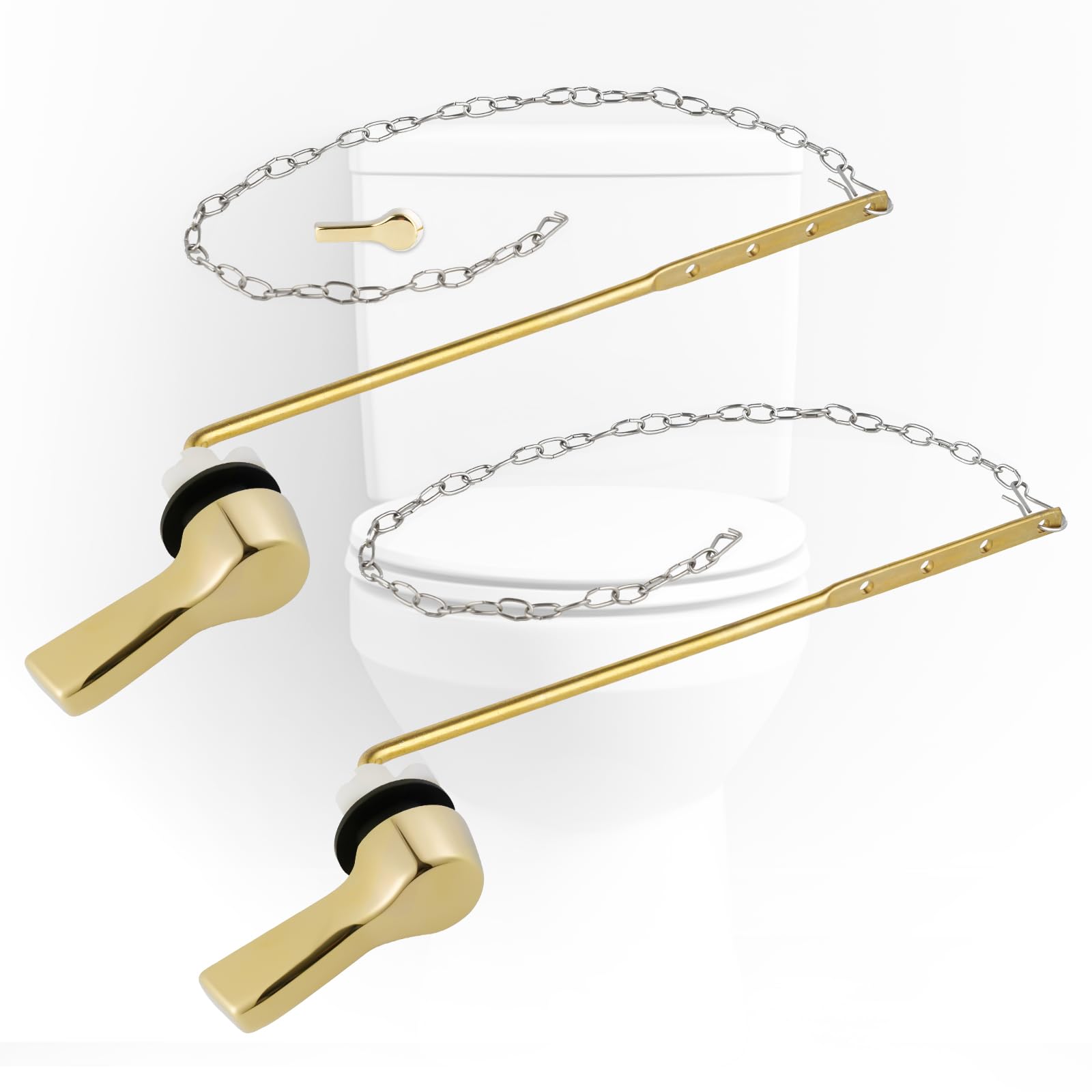 Metal Front Mount Toilet Handle Replacement Kit: Universal design to fit the most front mount toilet tanks, providing an easy fix for your toilet flush handle. There are four holes at the end of the lever for flexible length adjustment to suit the toilet tank Size Information: The Toilet Tank Lever fit for the front mount toilet tank. Wrench width: approximately 7.3cm/2.87 inch. Lever length: approximately 21 cm / 8.26inch. Flapper chains: 35.3cm/13.9inch High Efficiency Toilet Flushing: The combination of brass toilet tank handle and stainless steel toilet flapper chain provides a reliable solution for toilet bowl setup. With a focus on functionality and durability, this kit is an optimal selection for toilet enhancement Easy to Install: The sturdy handle is engineered for durability and effortless installation, requiring no tools. Please note that if the angle of the flush leaver is to large, you can adjust it by hand Wide Compatibility: It's compatible with brands including Kohler, TOTO, American Standard, Fluidmaster, Eljer, Delta, Mansfield, Jacuzzi, Glacier bay, etc. Upgrade your bathroom with iFealClear flush lever replacement for a seamless blend of form and function Universal Mount Brass Toilet Tank Lever: This sturdy brass lever incorporating flapper chains, combines solid brass construction with chrome-plated wrench. Provides durability and corrosion resistance. Compatible with Kohler, American Standard, TOTO, Mansfield, and Gerber toilets. Suitable for most common front-mount flush lever toilets.