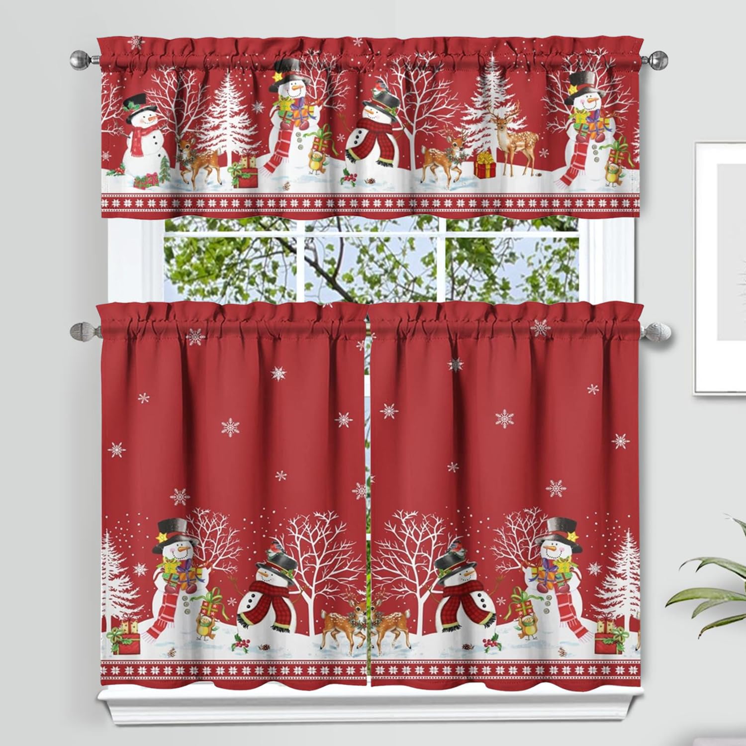 Christmas Decoration: This Christmas kitchen curtain has a unique design, incorporating classic Christmas elements like Santa Claus, a snowman, and a Christmas tree. The distinctive edge design adds an elegant touch, allowing you to fully embrace the festive spirit and create the perfect festive atmosphere for your Christmas High Quality Material: The red christmas snoman kitchen curtain set is made of 100% polyester. The material is soft to the touch and durable, providing privacy while keeping the room bright.Our kitchen curtains are not only decorative but also filter some heat to protect the furniture Christmas Kitchen Curtain Valance Set Dimensions: 1 piece valance 18" x 54" (45cmx135cm) and 2 pieces kitchen curtain 36"x27.5" (70cmx90cm) Multiple Application: Our xmas kitchen valance curtains are perfect for kitchens, farmhouses, laundry rooms, cafes, living rooms, bedrooms, offices, children's rooms and more. Ideal for your christmas kitchen home decor Easy Care : Machine washable, tumble dry on low, iron at low temperature, no bleaching and no softener.The creases caused by the packaging and shipping of your red christmas kitchen curtain valance set can be eliminated by ironing at low temperature Christmas Kitchen Curtains,Christmas curtains