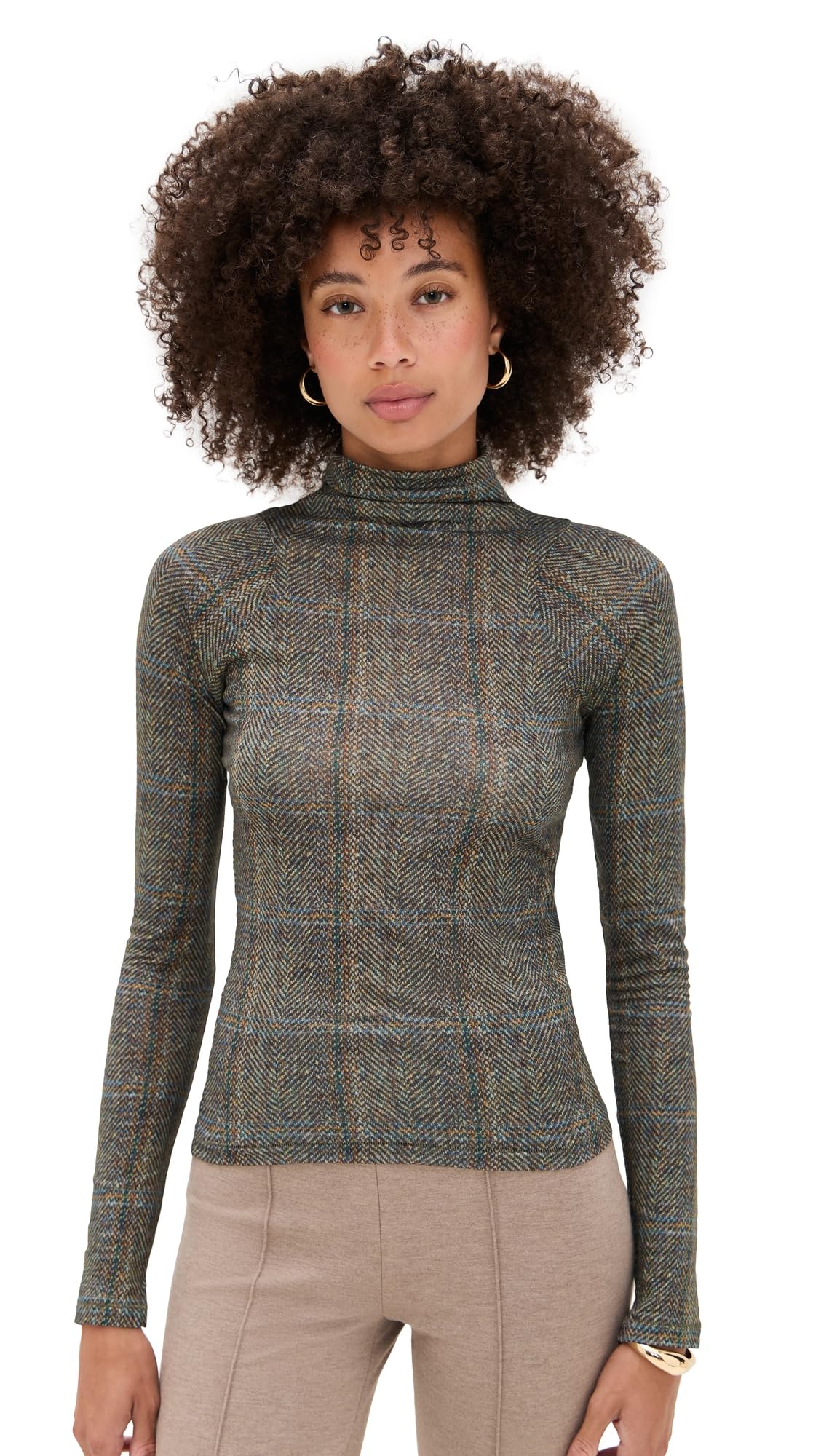 Fabric: Lightweight, super-stretch microjersey Plaid print Turtleneck Shaw Paneled Long Sleeve Turtleneck Tee